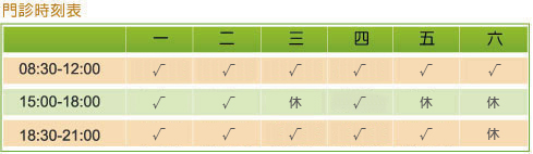 週一至週五 早診8點半至12點,午診3點至6點,晚診6點半至9點